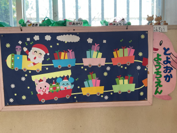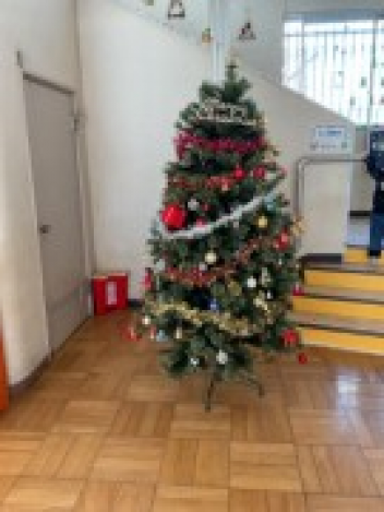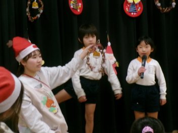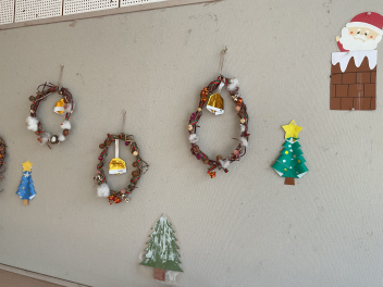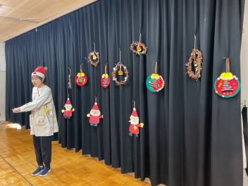 12月から昇降口には大きなクリスマスツリーが飾られています。年少さんがたくさんのオーナメントを飾ってくれました。各学級では、クリスマスごっこなどが遊びに取り入れられ、この日を皆で待っていました。毎年のように、遊戯室に集まり、各学年が製作したクリスマスの飾りの紹介がありました。年長さんのリースは、さつま芋のつるを使っての本格的なリースでしたね。それぞれ工夫してつくってくれました。