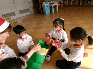 サンタさんが大きな袋を持っていることに気付いた子供たち。一人一人にプレゼントを渡してくれることになりました。年少さん年中さん年長さん、そしてひまわりぐみの小さい子たちも…。みんなニコニコ顔でした。