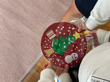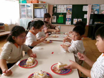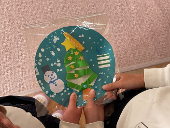 教室に戻ると、各学級の大きな靴下の中には、もう1つプレゼントが入っていました。綺麗な包み紙の中に何か入っています。サンタさんからいただいたプレゼントと靴下の中のプレゼント何だろう…と思っていたら、ケーキの箱も届きました。みんなで可愛いショートケーキを食べました。やっぱりクリスマスって最高!!
