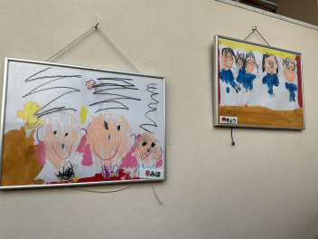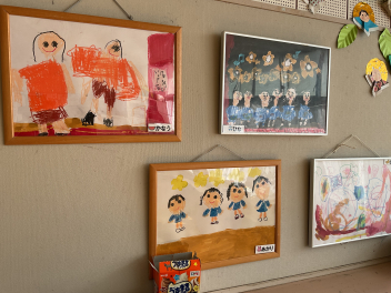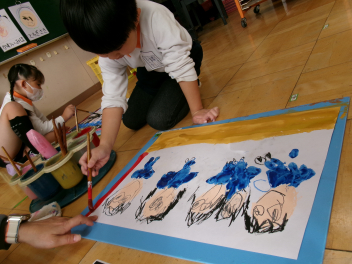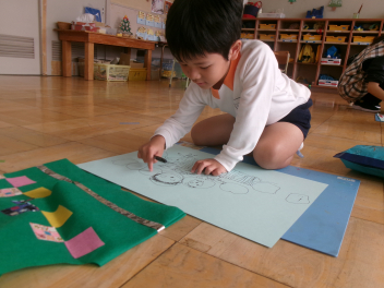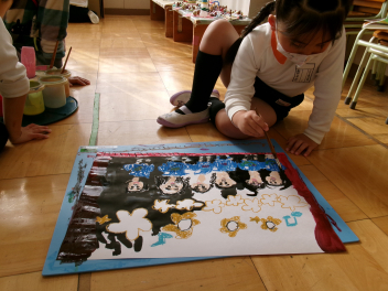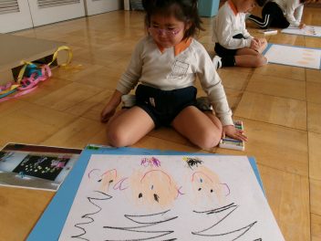 年中さん・年長さんたちは、描く前に、発表会で頑張ったこと、楽しかったシーンなどを聞いたところ、思い思いの場面を、思った通りすいすい描き始めました。子供たちの発想や、思いは本当に自由ですし、見たまま感じたままを表現するので、どの作品も素直で、思いが溢れ伝わってくる素敵な作品ばかりです。