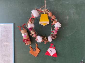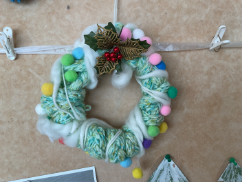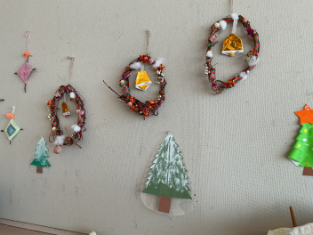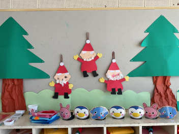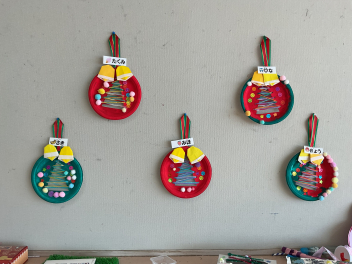 年長さんのリースは、さつま芋のつるをぐグルグルっと輪にし乾燥させて飾りをつけた本格的なものでした。年中さんは紙皿を使って少し立体のツリーで、年少さんは可愛いサンタさんの顔を描き、手足をつけて動きも出しました。