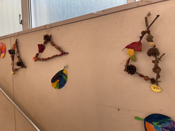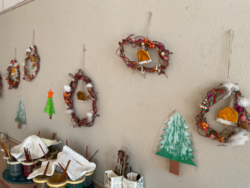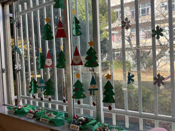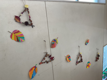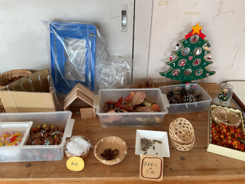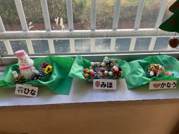秋の収穫物を使った飾りやタペストリーなど立体表現も子供たちは大好きです。年中さん年長さんの製作した壁飾りやクリスマス飾りは、お宅の壁にもぴったりな素敵な物でした。園務員さんも持ち前のセンスで、園舎内をクリスマスバージョンで飾ってくださっています。子供たちの作品は、クリスマス前に持ち帰りますので、どうぞお宅で飾ってあげてください。