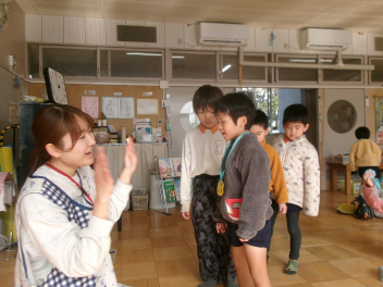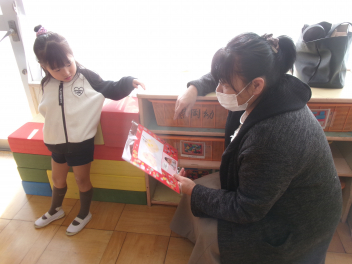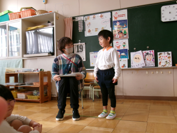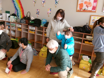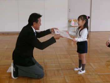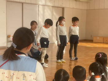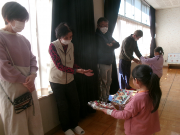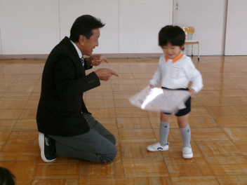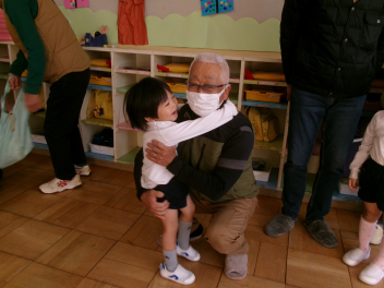 楽しい時間もあとわずかとなり、子供たちが心を込めて作った「プレゼント」を、参観会に来てくださった祖父母の皆さんにお渡ししました。抱っこしてもらったり、肩たたきをしたり、思いっきり甘えさせてもらいました。祖父母の皆さんは、もちろん全員が笑顔一杯でしたね。