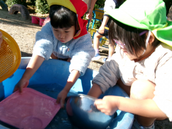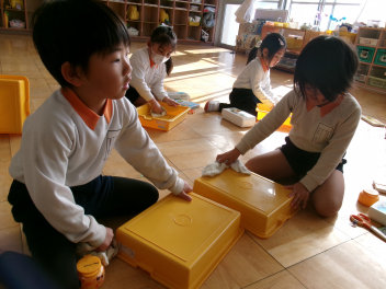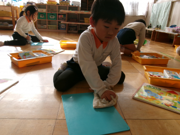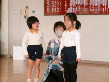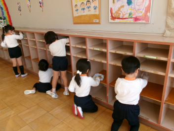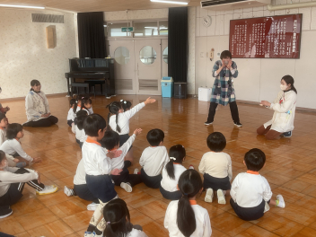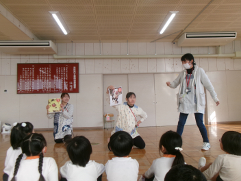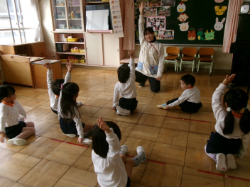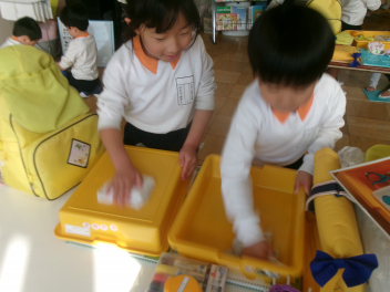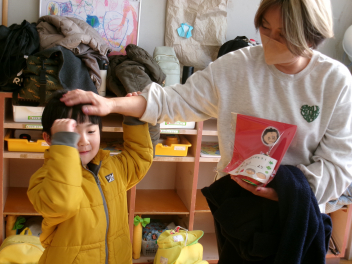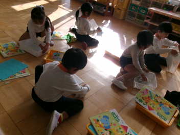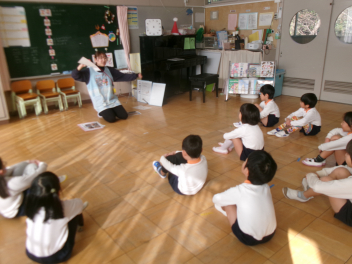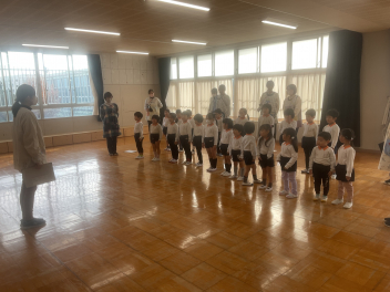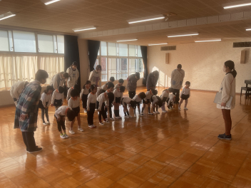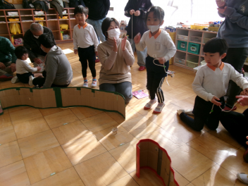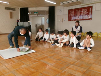 先ずは各教室にお集まりいただいた祖父母の皆さんに、登園後の自由な遊びなど、朝の様子をご覧いただきました。