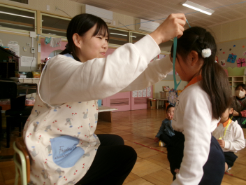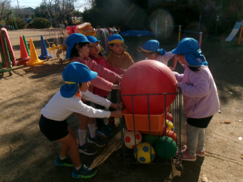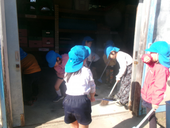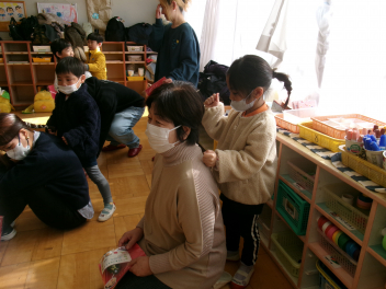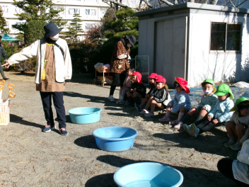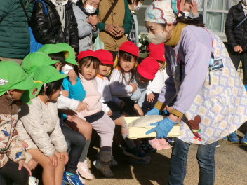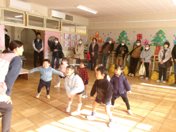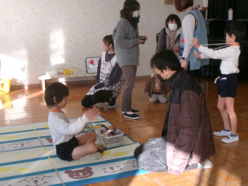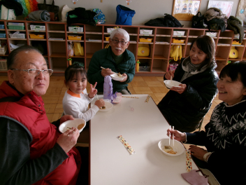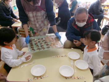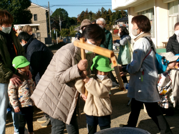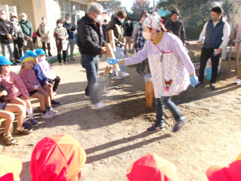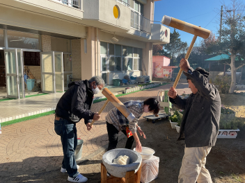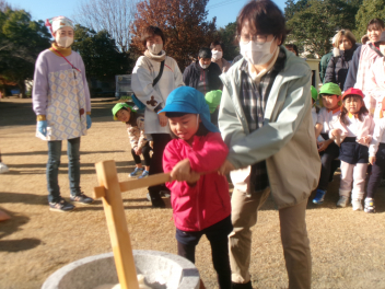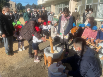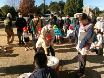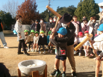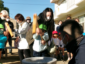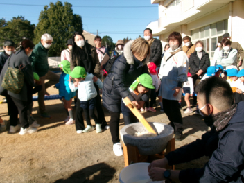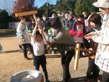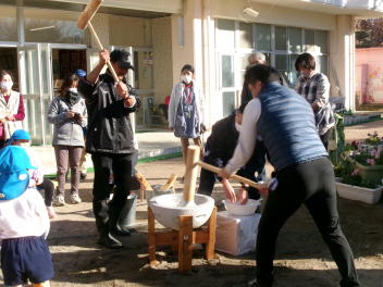 餅つき会は、2年前まではPTA行事でしたが、会員が減少する中、「園行事」としてどうしても残してほしいとのご要望があり、昨年度からは園の職員と、ボランティアの父母・祖父母で実施しています。今年も「餅米・餅つき・手返し」と「餅調理」のお手伝いをいただき、盛大に餅つき会を行うことができました。園舎内では、参加いただいた祖父母の皆さんと園児達と、昔の遊びなどをして楽しく過ごし、一緒につきたてのお餅をいただくという流れ。