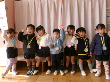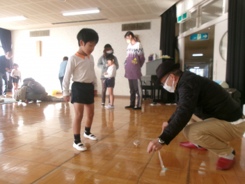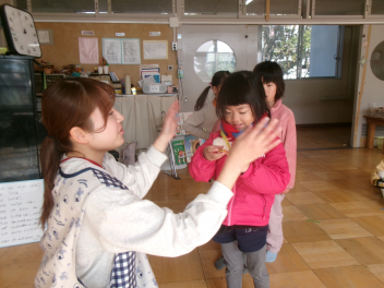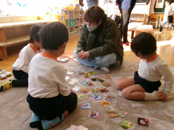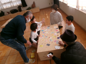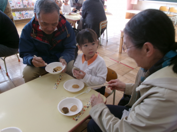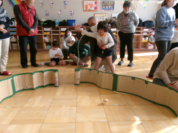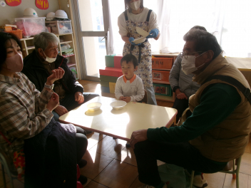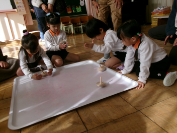 美味しいお餅をおやつに食べると、元気モリモリ。降園の時間まで、祖父母のみなさんと、コマ廻しやカルタなど昔の遊びを中心に各教室で楽しく遊びました。一人のお孫さんに4人の祖父母の方が来てくださったお宅もありました。コマ廻しの達人のじいじは、本当に上手でしたね!