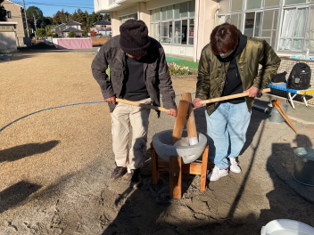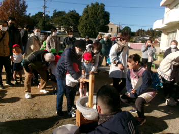 9時ごろになると、芝生広場の方から白い湯気がたくさん上がってきました。いよいよ餅つきの始まりです。一臼目は、ボランティアのお父さんと祖父母の皆さんでつき始めました。集まってきた子供たちが「よいしょ!よいしょ!」と掛け声をかけると、あっという間につきあがりました。今度は熱々のお餅をお母さん方が、切って丸めて黄な粉を付けて…と仕上げ。子供たちはもちろん、祖父母の皆さんも喉に餅を詰まらせることがないよう、とても小さく丸めて作りました。