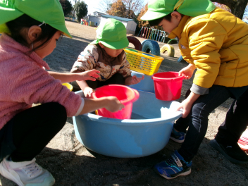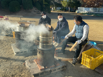 まずは火おこし・湯沸かしは、園長先生とお父さん方の仕事。8時ごろ火が入り、登園の時間にはお湯が沸き始めていました。
