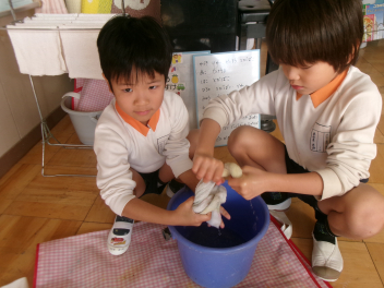 餅つきでは、最初の「こね」が大切。お父さん方がコネコネ・コネコネと蒸らした餅米の粒が見えなくなるまでこねてくれました。大人が少しつくと「ペタリ」とお餅のようになってきました。年少さんから祖父母と一緒につきました。「よいしょ!よいしょ!」と周りからの掛け声で、一生懸命つきました。