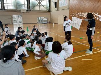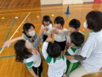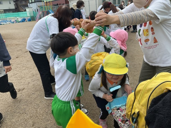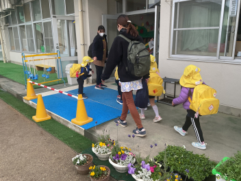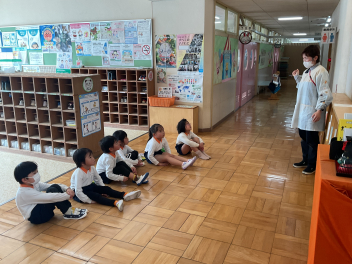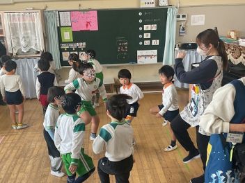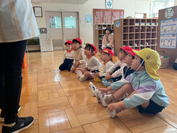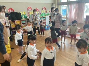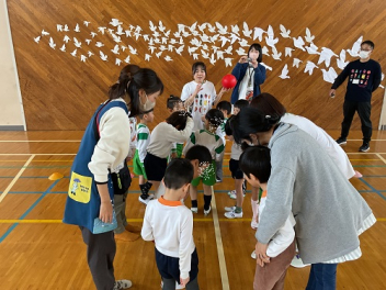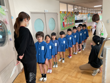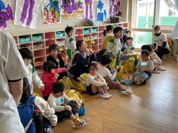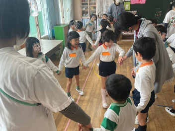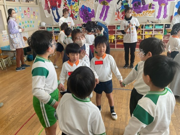 今回は、園庭が使えなかったこともあって、各学年がまとまって交流しました。グループも一緒だったので、名前を覚えることができ、声を掛け合って遊ぶ姿が見られました。帰りの時間は、園庭に全員が輪をつくって、初生の園長先生のお話を聞いたり、初生の子たちのアーチをくぐって別れを惜しみました。駐車場には、お母さん方が待っていてくれました。今回も送迎にご協力いただきありがとうございました。