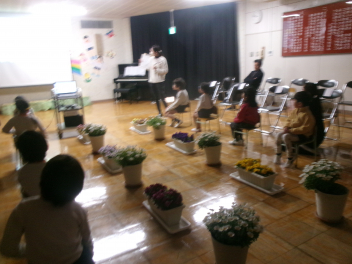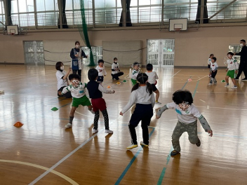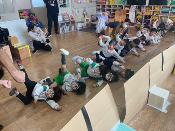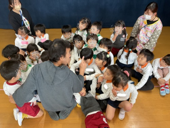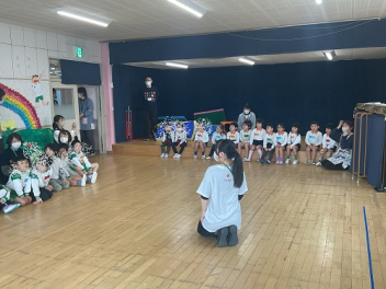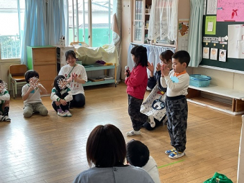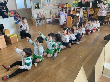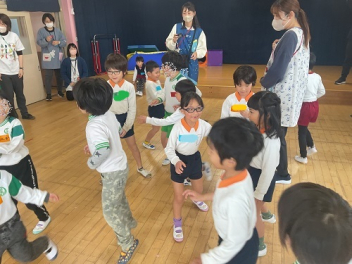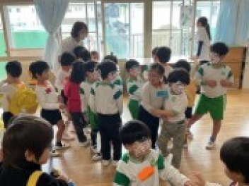 まずは各学級で自由な遊び。年少さんは、初生の元気一杯の先生が中心になって、遊んでくれました。どの学級も共通して「ともだちできちゃった」で踊りながらみんな仲良しになりました。年少さんはみんなで大型バスをつくって「ばすにのって」で遊びました。みんなでやると本当に楽しかったですね!