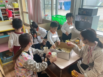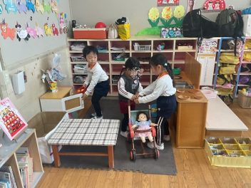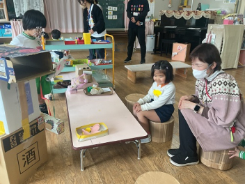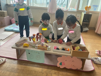 年中さんの部屋には、お店屋さんのセットができていて、キッザニアで遊んだばかりの年中さんは、すぐに一緒になってお店屋さんごっこが始まりました。