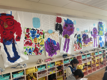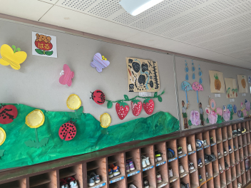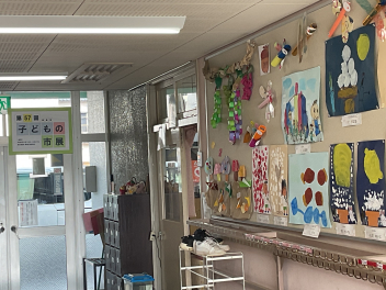 前半はここまでです。初生幼稚園は、みんなが集まるこのタイミングで「こどもの市展」を開催していました。玄関周りや保育室の廊下には作品がたくさん飾ってありました。子供たちの作品を見合うのもいいなあと感じました。
