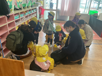 お昼を食べるとひまわりぐみさんはもう帰る時間です。何と年少さんは素敵な「プレゼント」を用意してくれてありました。とっても可愛いカラフルなお花のネックレスです。首にかけてあげるとみんな喜んでくれました。「バイバイまた遊ぼうね!」とあいさつをしてお別れしました。4月から一緒に遊ぼうね!