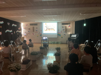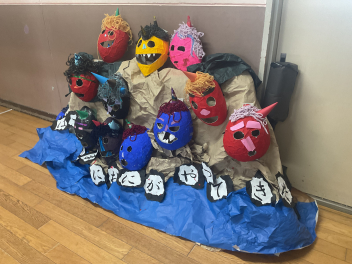 まずは、お楽しみの時間が来るまで、うさぎ組で年少さんと一緒に遊びました。その後は遊戯室に集まって園長先生のお話や先生方による「おたのしみ」がありました。先生方が「くいしんぼうおばけ」をパネルシアターで上演してくれました。何と、最後に振り返ったお母さんもおばけのお母さんでしたね!
