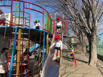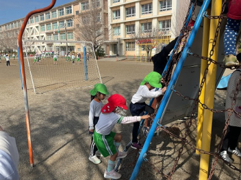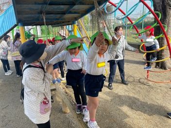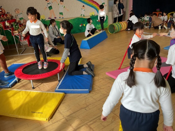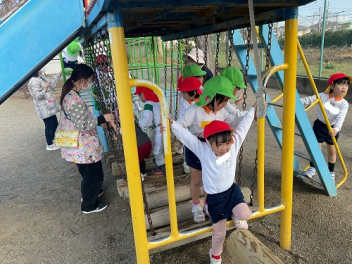 • 前日の雨で園庭が使えなかったので、ここからは少し変則的です。年少と年中は、遊戯室でサーキット遊び。その後は、初生小学校に行って、小学校の総合遊具で遊びました。ボルダリングで登ったり、揺れる橋を通って移動したりと、初めて経験する動きや遊びで夢中になって遊びました。幼稚園に戻ってお昼になりました。