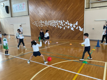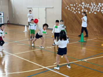 年長さんは、遊戯室に移動して、「もうじゅうがり」や「カードめくりゲーム」などをして遊んだ後、少し早めのお昼。その後は、初生小の体育館をお借りしてドッジボールで遊びました。初生幼稚園のお友達は、ドッジボールがブームで、投げる球も早いし、ルールが良く分かっていて最初は圧倒されてしまいましたね。だんだん分かってくるととても楽しく遊べました。