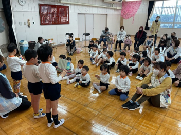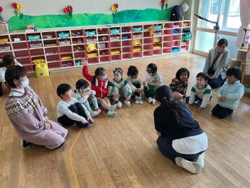 来年度の新入園児は8人です。豊岡幼稚園を選んでいただき本当にありがとうございます。(未就学児のサークル)ひまわりぐみでいつも幼稚園で遊んでいましたが、今回は、何と年少組さんと一緒に遊ぶ機会がありました。どんな1日だったのでしょうね。