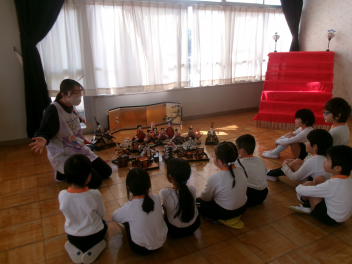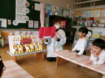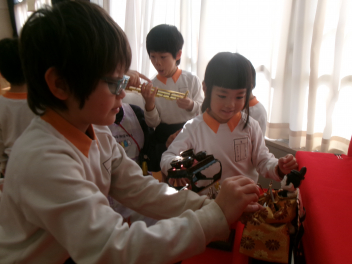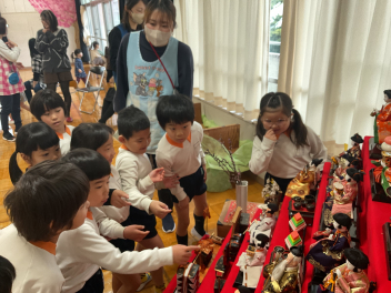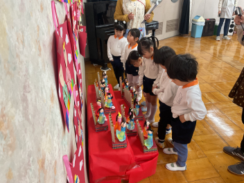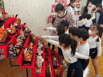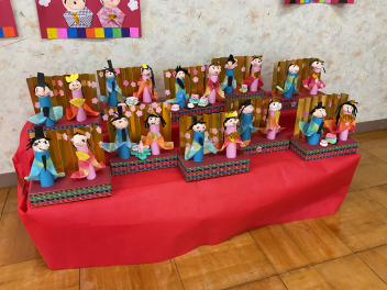 2月の終わりに、まずは年長さんがひな人形を飾ってくれました。もちろん男の子も女の子も関係なく、みんなで綺麗に飾りました。