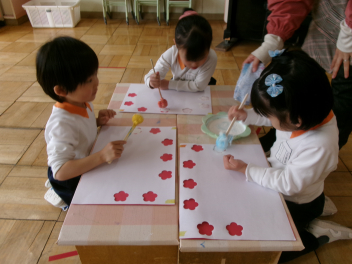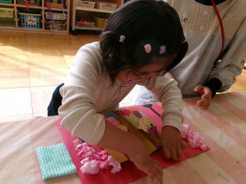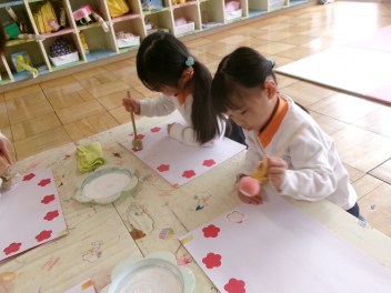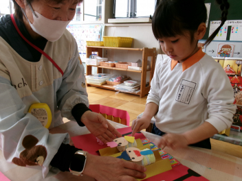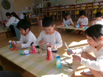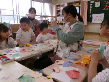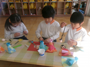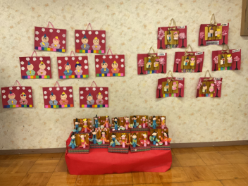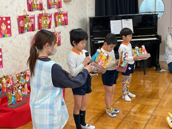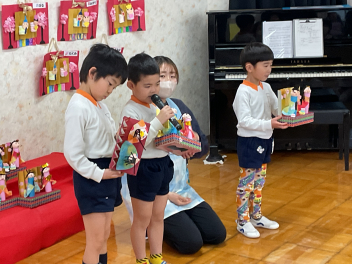2月の後半は、各学級でそれぞれのひな人形を製作しました。年少さんと年中さんは平面や半立体のひな人形。年長さんはトイレットペーパーの芯を使って立体のひな人形をつくりました。