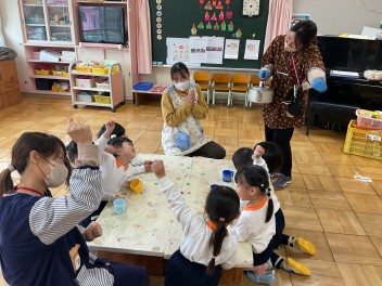 最後に、たくさん作ったお花の首飾りを、園長先生や主任の先生、園務員さんにもあげました。とっても喜んでくれたので、年少さんもみんな大喜びでしたね!ありがとね!