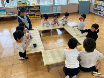 紹介が終わると、みんなで「ひなまつりのうた」を歌いました。少し難しい言葉もありましたが、年少さんも4番までしっかりと歌ってくれました。ひな祭り会を終え、他の学年のひな人形を見た後は、各教室で「ひなあられ」をおやつにいただきました。アサヒ飲料からいただいたカルピスも美味しかったですね!