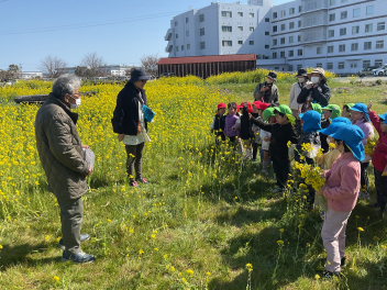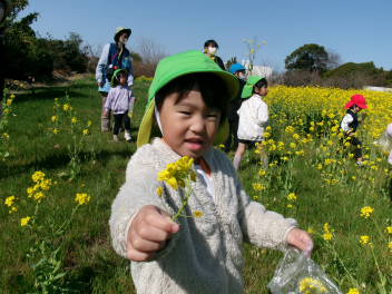 菜の花畑には「土筆(つくし)」もたくさん顔を出していて、土筆を採って持ち帰る子も多くいました。待ちに待った春が来ているのですね。春の温かな日差しに包まれたうららかな日のせいか、子供たちの表情はとても晴れやかで生き生きしていました。