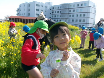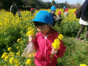 菜の花摘みも許可いただいていたので、「お母さんにもっていきたい。」「家に飾りたい。」と思い思いに、菜の花畑の中を夢中になって遊びました。花を摘んで歩いたり、背の高い菜の花に座ってかくれんぼしたり…。春の日差しを浴びながら夢中になって遊びました。先生方の方も子供たち以上に楽しそうな表情でした。