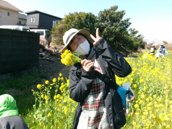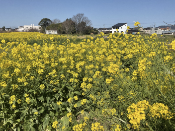 豊岡小正門の通りを東に向かい、テクノ道路に出る手前南側にとても広い菜の花畑があったのを覚えていらっしゃいますか?持ち主は広大な野原の真ん中の家にお住いの松浦さんです。大きな建物が立つ予定とのことで昨年は見学できませんでした。昨年は、タックシーで都田公園まで行って、河津桜を見て春を感じてきました。今年は、松浦さんの土地の南側で菜の花を育てていらっしゃり、お願いにあがると笑顔でご快諾いただきました。