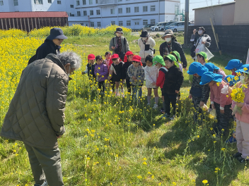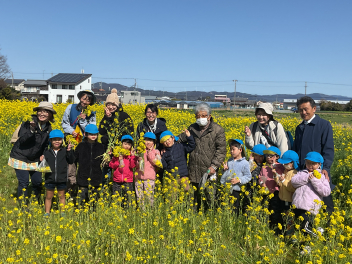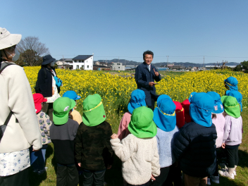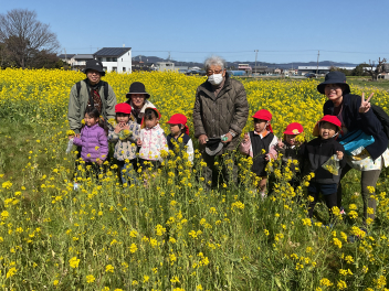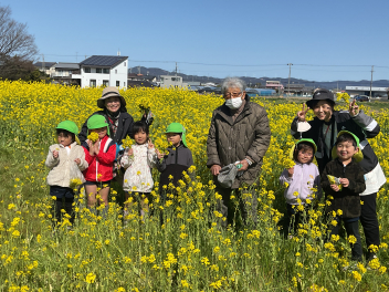 途中から何と松浦さんも遊ぶ様子を見に来てくださって、記念写真にも入っていただきました。最後には、お話を伺ってみんなでお礼を言いました。松浦さんは背筋もピンと伸び、畑の中をすたすたと歩き、お話もとても上手。何と昭和3年生まれだそうです。来年も菜の花の種を撒いてくださり、豊岡幼稚園の子達を遊ばせてくださるそうです。ありがたいですね!