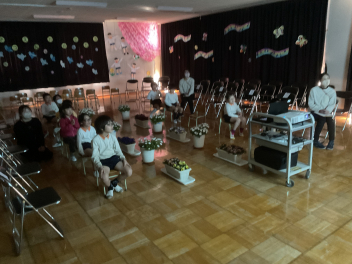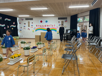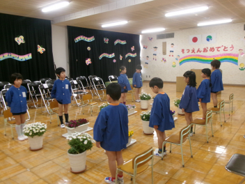 卒園式まで今日を入れてあと5日となりました。主役の年長さんは、これまで何回か練習して本番に備えていますが、金曜日には年少・年中も参加してリハーサルを行いました。春の花が綺麗に咲いたプランターが並べられ「花道」を通っての練習は年長さんも初めてでした。本番では、年少・年中は、卒園式の前半うさぎ組の部屋で大型テレビを見ながら出番を待つことになっていますので、修了証書授与などの年長さんの様子を見られるのはこのリハーサルしかありません。年長さんの緊張感も感じてくれたものと思います。本番の感動が薄れないよう、詳細な様子は控え目にしてお知らせします。