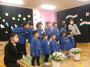 年少さん・年中さんが心を込めて「送ることば」と歌のプレゼント。それを受けて年長さんが、「別れのことば」と歌を返します。初めから会場に居てリハーサルを見ていた年少さん年中さんは、短縮して練習したとしてもかなり長い時間を頑張ってくれました。立派でした。もちろん年長さんは「仕上げ」にふさわしい立派な態度でした。