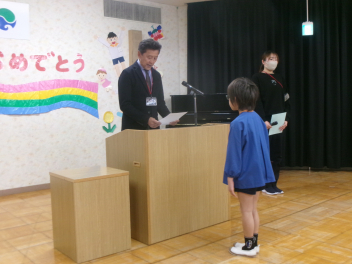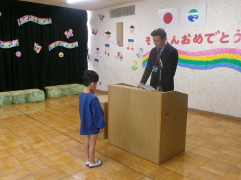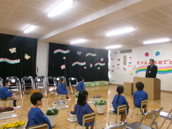 廊下で緊張の中待っていた年長さんが、年少さん年中さんの拍手を受けて入場。内側を向いて自分の席へ着席。例年と同じようにお母さん方は、子供たちの顔が見えるように反対側に席をつくってあります。園歌を歌い、修了証書授与。証書をお母さんに渡しながらいただいたことを報告。園長先生のお話、PTA会長さんの祝辞と続きます。来賓紹介や祝電披露があって、年少・年中が入場し、年長さんと向かい合って「送ることば」と「お別れのことば」とクライマックスへ。卒園生が退場して終了となります。