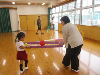 子供たちは、体操をしたり、パラバルーンをしたり、運動遊びをしたり、リレーをしたりなど、小松幼稚園の友達と楽しく遊ぶことができました。