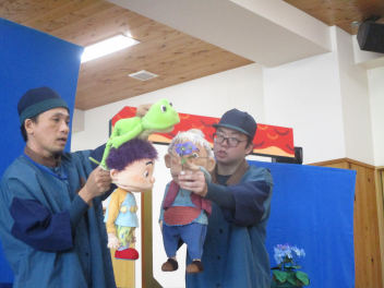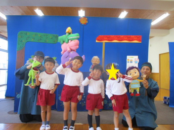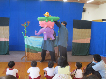 今日は、人形劇むすび座さんにお越しいただき、「ぞうくんのさんぽ」と「ぺらがえる」の人形劇を見せていただきました。