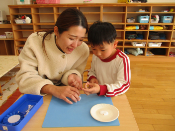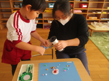 お茶会終了後、年長児は、卒園に向けてお家の人と一緒にコサージュづくりをします。
