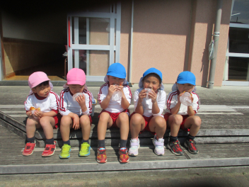 今日は、今まで楽しく幼稚園で遊んだごほうびでパンを食べました。