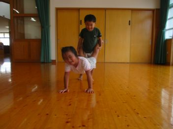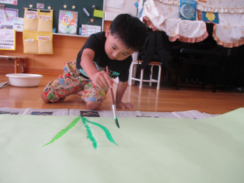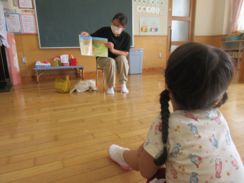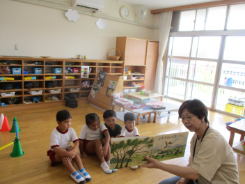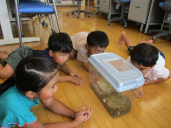 幼稚園に戻ると、教室で飼育しているカマキリの様子を見ます。