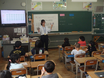 かけ算の意味や表記の学習から始まり、計算カードを使った九九の習熟があり、今日はまとめとして、かけ算の式に合う問題を作りました。教科書の場面絵を見て、その絵に合う問題を作ります。
