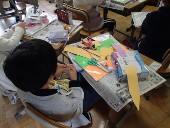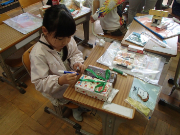 算数科の学習でも使った空き箱をベースに、さまざまな飾り付けをして自分だけのお気に入りの「たいせつボックス」を作ります。