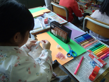 色工作紙だけでなく、リボンやモール、ビーズなどを使って思い思いの飾り付けをしていきました。ビーズやモールはボンドを使って貼り付けるため、完全に接着するまでに時間が掛かります。カラーペンで色をつけていくこともいい飾りになっています。