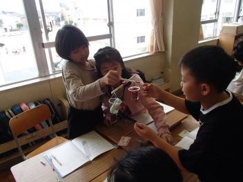 子供たちは消しゴムやのりなどの重さを量って測っていきます。天秤が水平になるのを確認しながら、慎重に積み木を反対側の器に入れていきました。グループの人と一緒に夢中になって、楽しく調べていました。