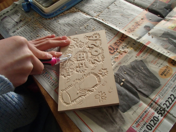 下絵をカーボン紙で板に写し、彫刻刀で彫っていきます。