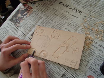 上面の板には卒業にちなんだ文字やイラストを描き、彫刻刀で浮き彫りにしています。