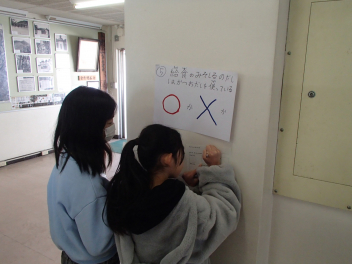 廊下には、○×クイズやクロスワードパズルが掲示され、休み時間には多くの子が訪れていました。