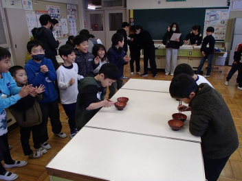 各学級代表2人が、お椀に入れられた大豆、小豆、金時豆を箸でつまんで、となりのお椀に入れていきます。