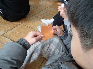 この話を聞いた後に、子供たちには折り紙と大豆1粒が入った袋が分けられました。
