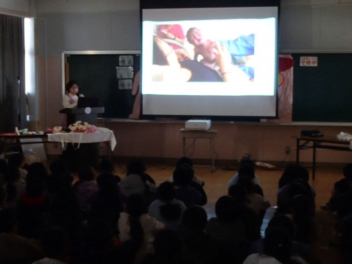 子供たちに、お母さんのおなかの中の胎児の姿勢を体感してもらっている間に、教室ではスライドの準備が進められました。