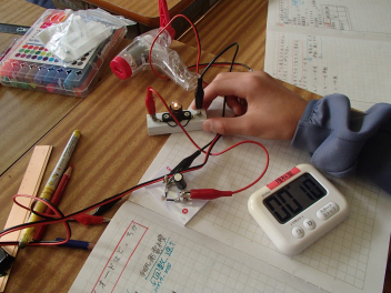 その後、コンデンサーを豆電球あるいはLEDにつなぎます。豆電球やLEDに明かりがついている時間を計測して、その違いを調べていきました。