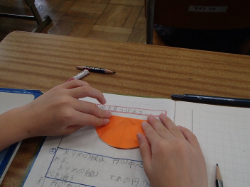 円に切られた折り紙を、位置を替えて何度か半部に折ることで円の中心を見つけました。